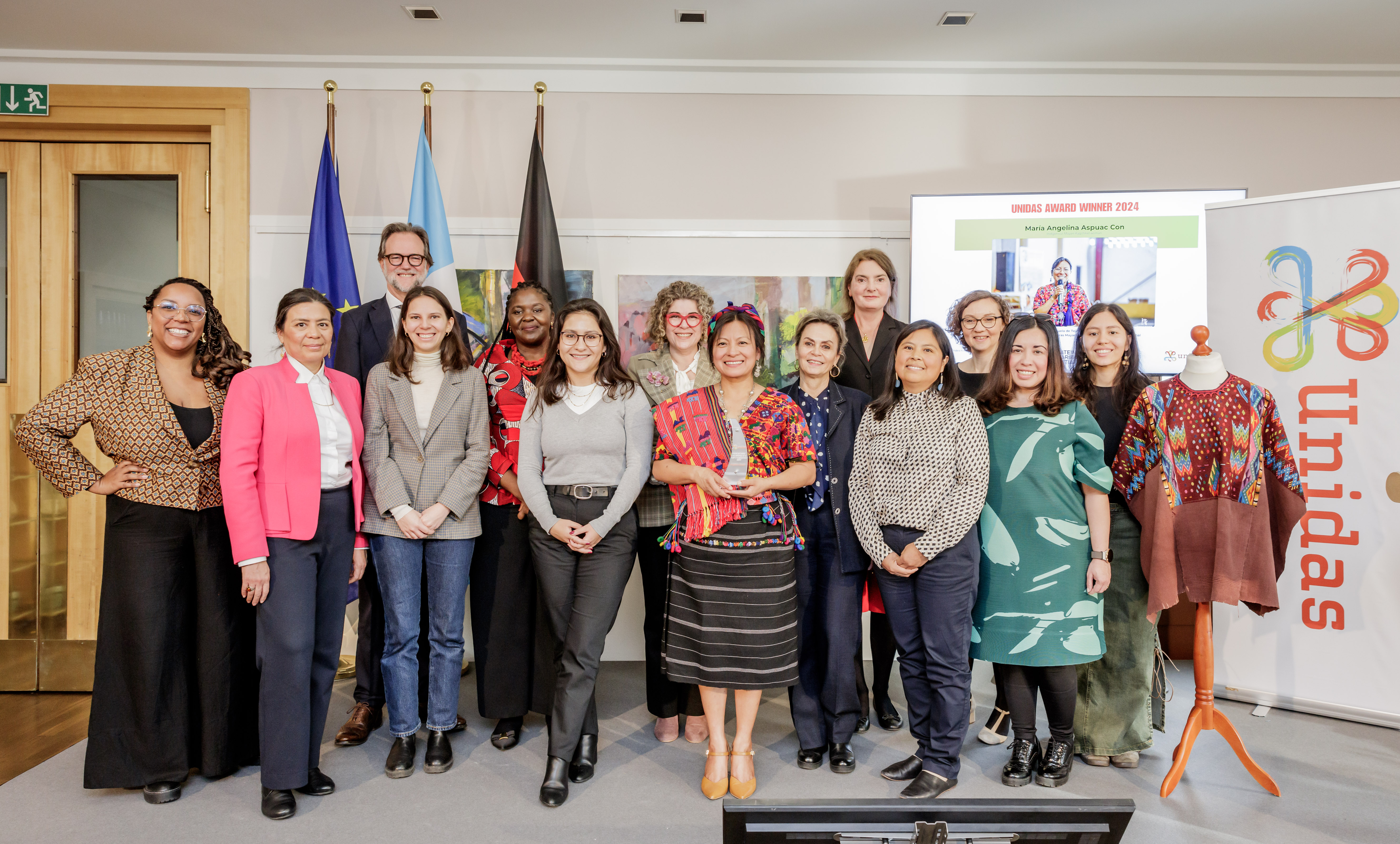 In 2024, we proudly honored María Angelina Aspuac, a Maya Kaqchikel advocate from Guatemala, with the prestigious Unidas Award for Women’s Rights and Democracy. Angelina has been a tireless voice in defending the economic rights of Indigenous women, especially through her work with weavers to protect their traditional textiles and address exploitation. As the founder of the Movimiento Nacional de Tejedoras and a member of the Women’s Association for the Development of Sacatepéquez (AFEDES), she leads initiatives to defend intellectual property rights and preserve Indigenous heritage.